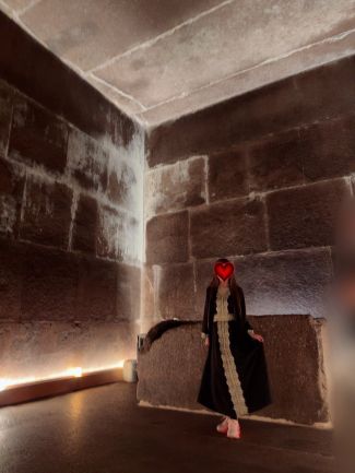 クフ王のピラミッドの内部の写真です。(前屈み…と言いますより、体をほぼ半分に